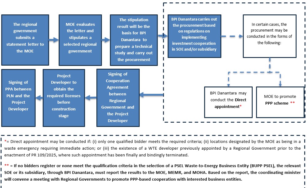 Under PR 35/2018, regional governments could appoint regional-owned enterprises (“ROEs”) or conduct open tenders to select WtE project developers. Where no private developer was interested or qualified, and no ROE was capable of undertaking the project, state-owned enterprises (SOEs) could be assigned to develop and operate WtE plants.